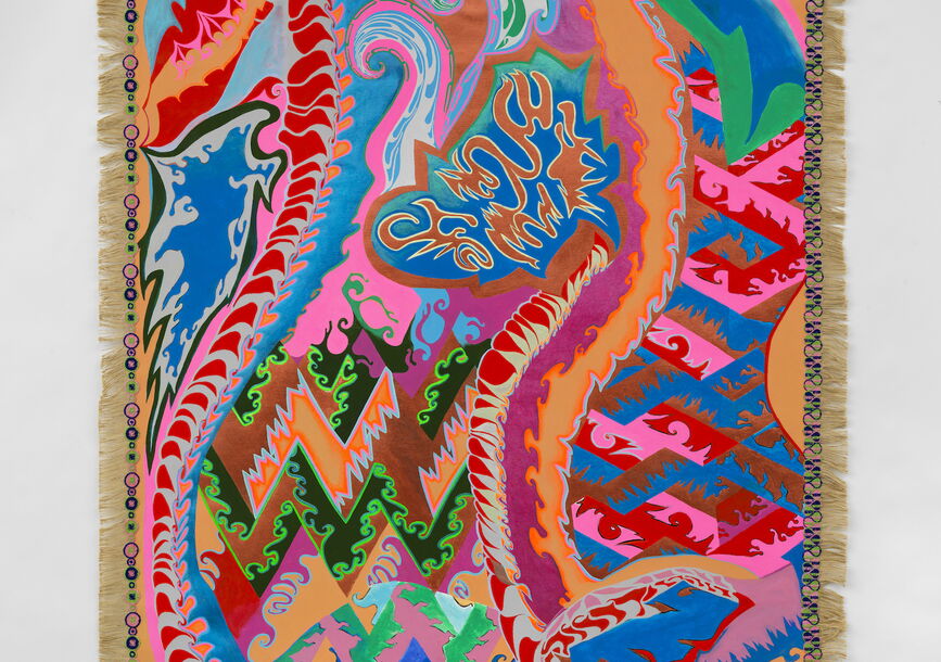 Lisa Alvarado (b. 1982) is an American visual artist and performer known for her free-hanging abstract paintings. Her works operate as stage sets and artworks simultaneously and engage with abstraction beyond the parameters of Western art history. Alvarado’s paintings accompany musical performances as a mobile setting for the band Natural Information Society, for which she plays harmonium. Alvarado’s work is included in the Whitney Biennial 2022: Quiet as It’s Kept, Whitney Museum of American Art, New York. Previous solo exhibitions include Scab Diagram, The Modern Institute, Glasgow, Scotland (2021); Thalweg, Bridget Donahue, New York, New York (2020); Polyphonic Shadow Cloth, LC Queisser, Tbilisi, Georgia (2018); Sound Talisman, Bridget Donahue, New York, New York (2017); Traditional Object, Soccer Club Club, Chicago, Illinois (2013); and Limpia, Soccer Club Club, Chicago, Illinois (2012). She has also exhibited her work at the Bergen Kunsthall (Norway); Institute of Contemporary Art( Philadelphia); Museum of Contemporary Art Chicago; Bridget Donahue (New York); The Modern Institute (Glasgow); and KMAC Museum (Louisville). Selected performances include Palais de Tokyo (Paris); Pitchfork Music Festival (Chicago); Big Ears Music Festival (Knoxville); Rewire Festival (Netherlands); Institute of Contemporary Art (Philadelphia); Japan Society (New York); The Common Guild (Glasgow); and Serralves Museum of Contemporary Art (Portugal). Alvarado is represented by Bridget Donahue in New York.